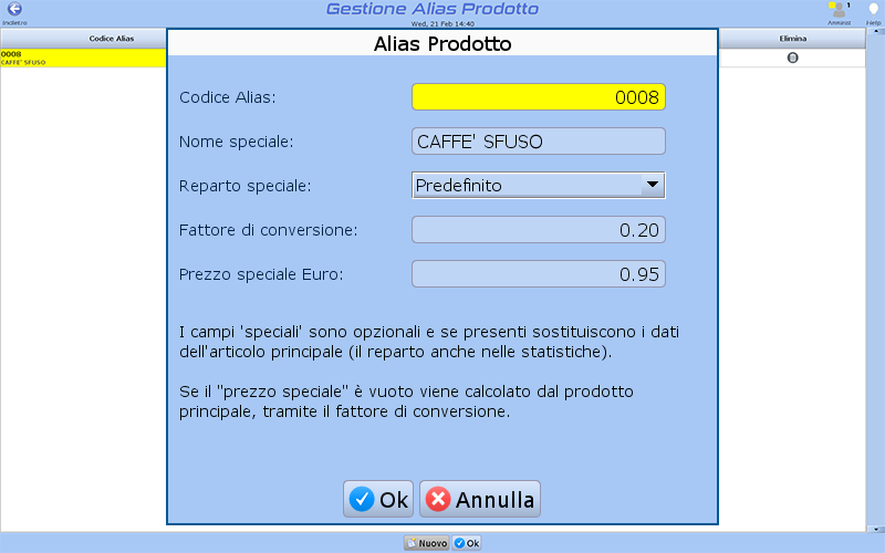 Una volta creati, gli alias possono essere richiamati per la vendita (vedi relativo help cliccando qui e per le operazioni di Caricamento veloce (vedi relativo help cliccando qui);